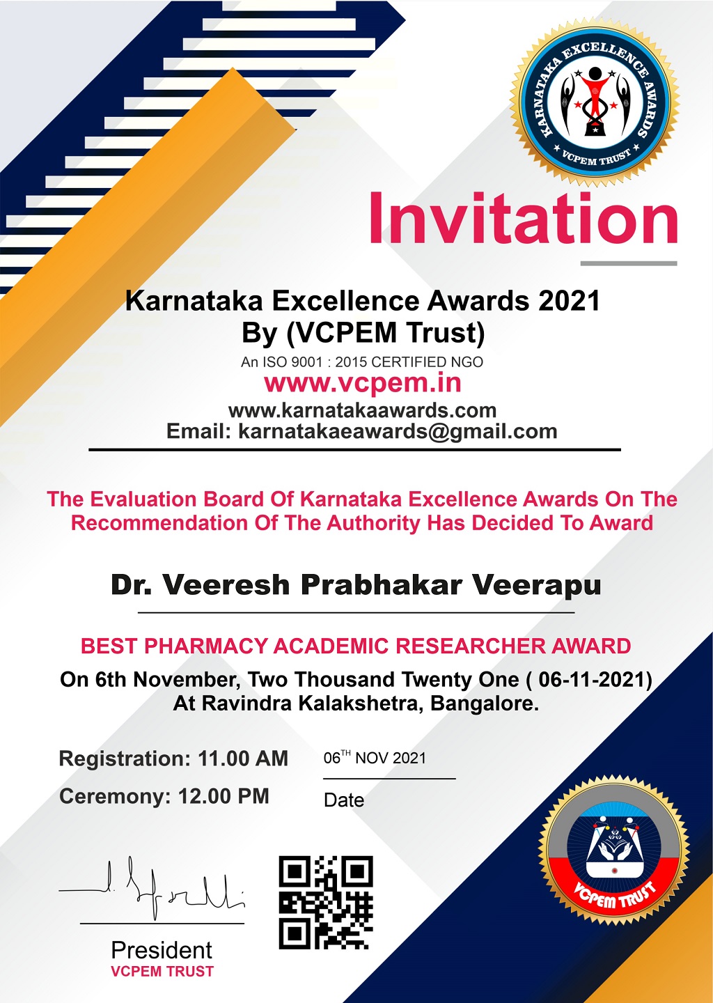 Our institution has received the Best Pharmacy College and Best Principal awards for the year 2020 and 2021 from Karnataka Education Awards, Bangalore.